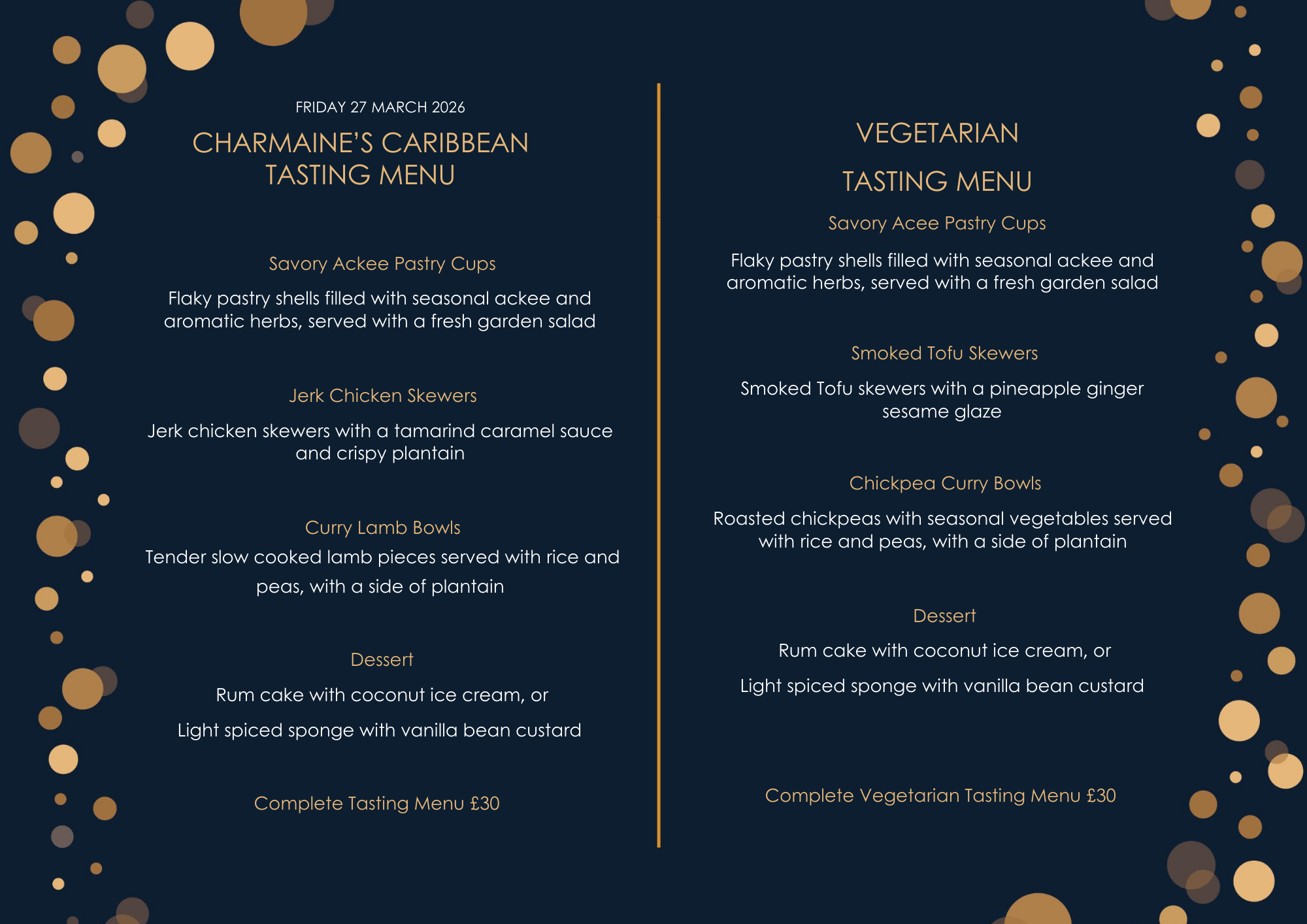 Back to All Events Charmaine’s Caribbean Tasting Menu Friday 27 March 2026 18:00 22:00 Google Calendar ICS Book now
