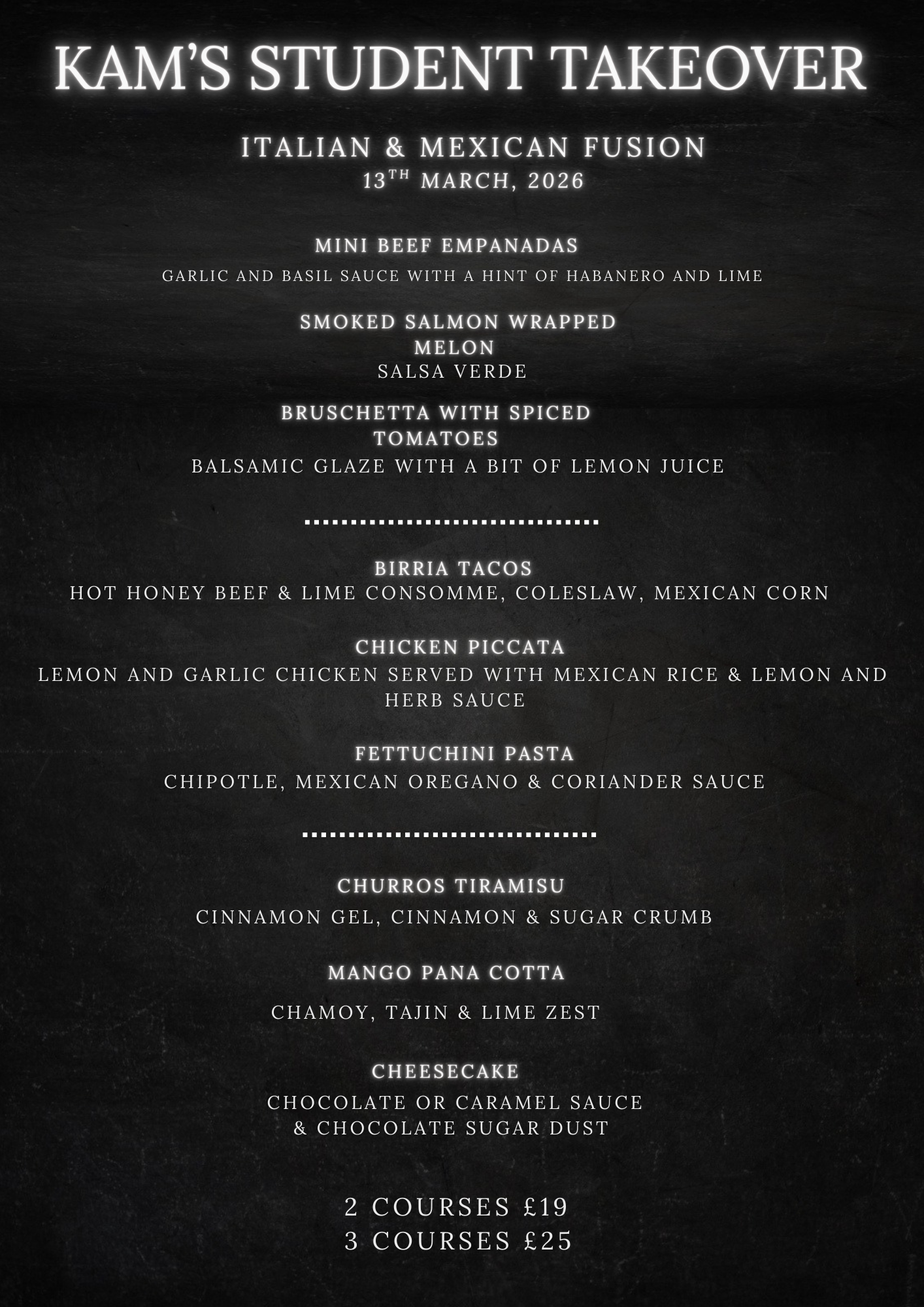 Back to All Events Kam’s Student Takeover - Italian & Mexican Fusion Friday 13 March 2026 18:00 22:00 Google Calendar ICS Book now